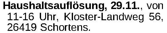 Haushaltsauflösung, 29.11., von 11-16 Uhr, Kloster-Landweg 56, 26419 Schortens.Kontakt