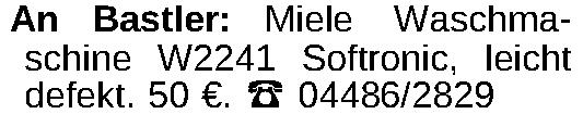 An Bastler: Miele Waschmaschine W2241 Softronic, leicht defekt. 50 €. 04486/2829