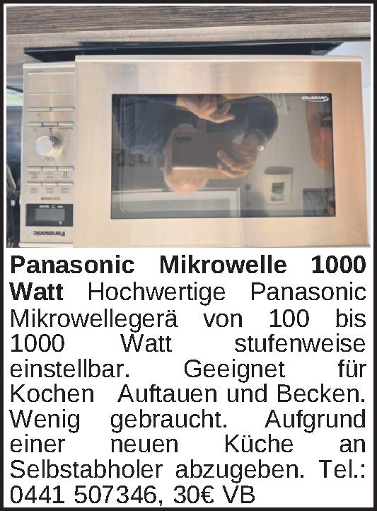 Hochwertige Panasonic Mikrowellegerä von 100 bis 1000 Watt stufenweise einstellbar. Geeignet für Kochen Auftauen und Becken. Wenig gebraucht. Aufgrund einer neuen Küche an Selbstabholer abzugeben.Tel.: 0441 507346