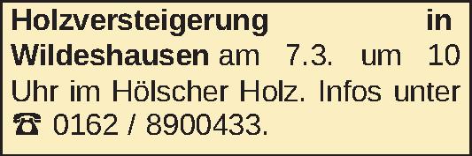 Holzversteigerung in Wildeshausen am 7.3. um 10 Uhr im Hölscher Holz. Infos unter 0162 / 8900433.