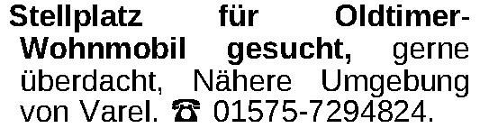 Stellplatz für OldtimerWohnmobil gesucht, gerne überdacht, Nähere Umgebung von Varel. 01575-7294824.