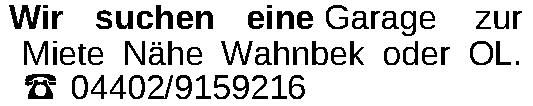 Wir suchen eine Garage zur Miete Nähe Wahnbek oder OL. ‡ 04402/9159216Kontakt