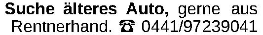 Suche älteres Auto, gerne aus Rentnerhand. ‡ 0441/97239041Kontakt