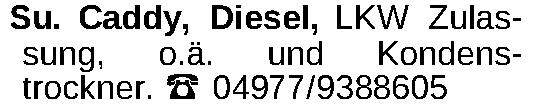Su. Caddy, Diesel, LKW Zulassung, o.ä. und Kondenstrockner. ‡ 04977/9388605Kontakt