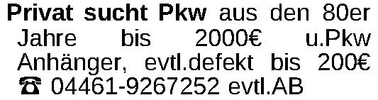 Anzeigentitel: PRIVAT SUCHT KFZ aus den 80er Jahren bis 2000€