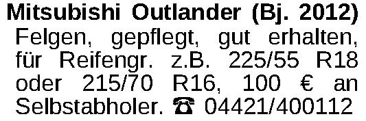 Mitsubishi Outlander (Bj. 2012) Felgen, gepflegt, gut erhalten, für Reifengr. z.B. 225/55 R18 oder 215/70 R16, 100 € an Selbstabholer. ‡ 04421/400112Kontakt