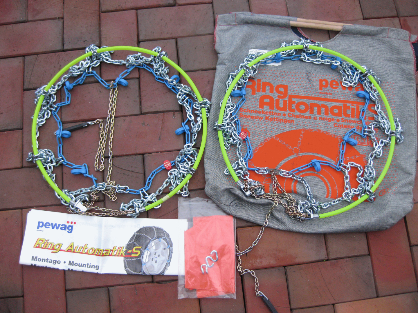 Die Schneeketten wurden einmal (zum Anfahren auf einem Campingplatz) benutzt. Verstärkte Kettenglieder mit 4,5 mm Durchmesser. Kein Rost!Wurden seitdem im Keller trocken gelagert.