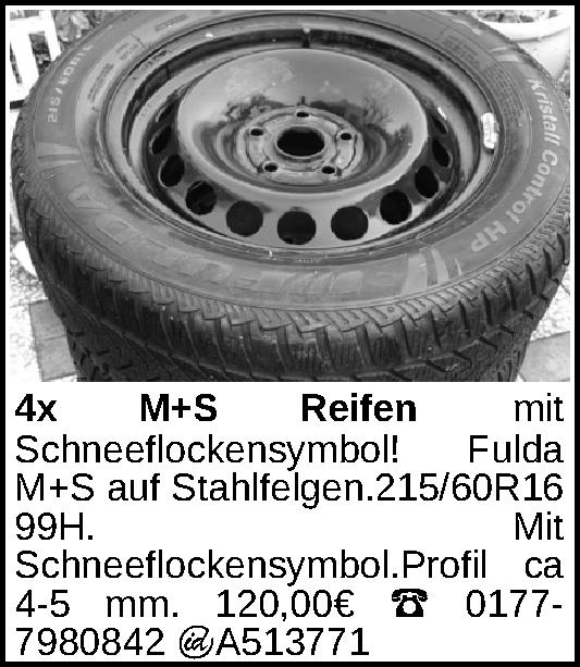 Fulda M+S auf Stahlfelgen.215/60R16 99H. Mit Schneeflockensymbol.Profil ca 4-5 mm.Kontakt