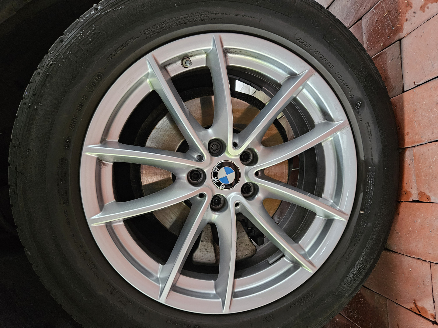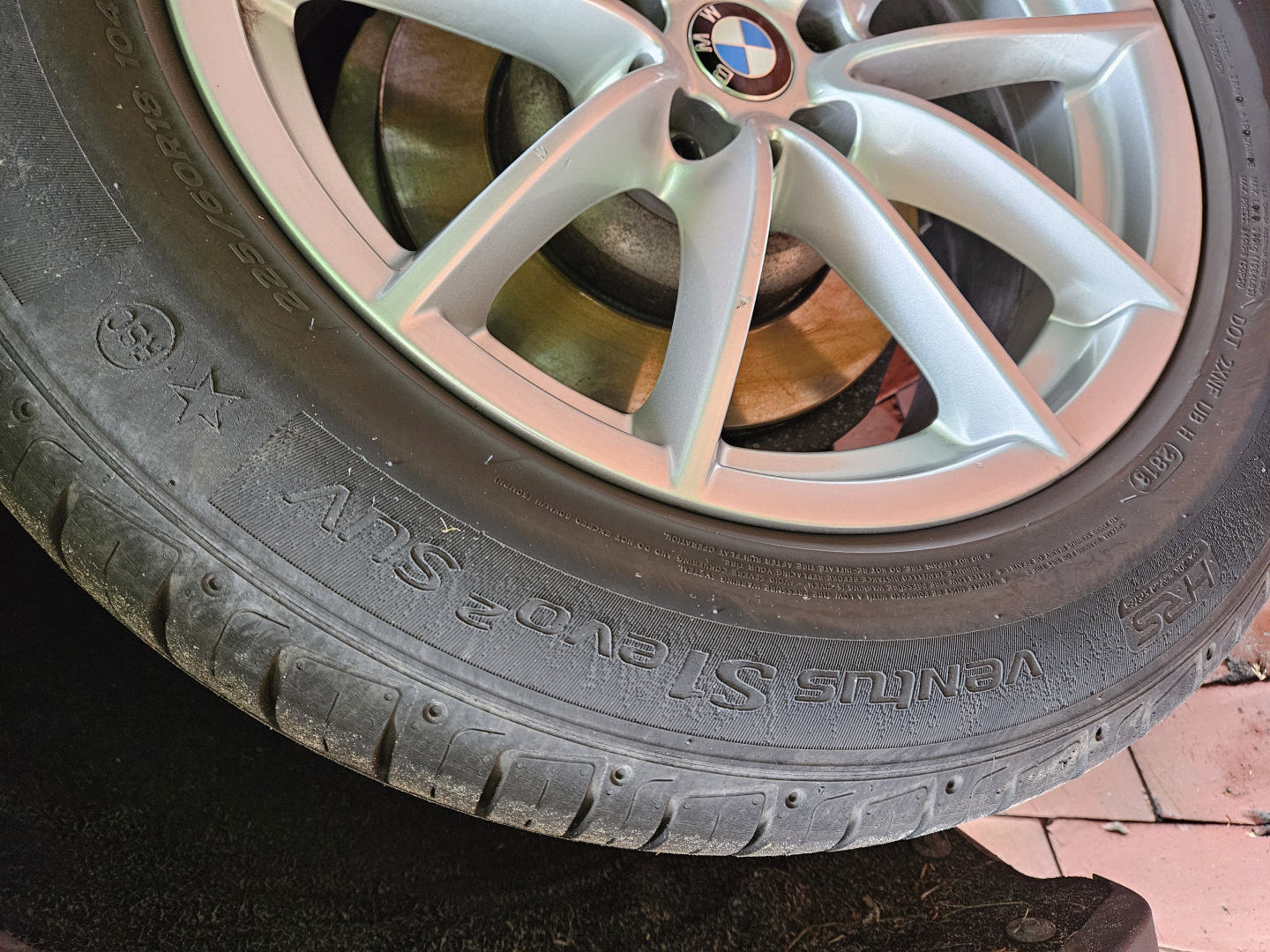 Montiert sind Sommerreifen 225/60R18 104 W, BMW Stern, Hankook Ventus S1 evo2 SUV, DOT 28 19, ca. 3 mm, Notlaufeigenschaften. Hinweis Werkstatt: Außenflanke porös, VL Profil hat Risse/Kerben.