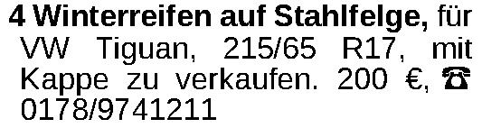 4 Winterreifen auf Stahlfelge, für VW Tiguan, 215/65 R17, mit Kappe zu verkaufen. 200 €, ‡ 0178/9741211Kontakt