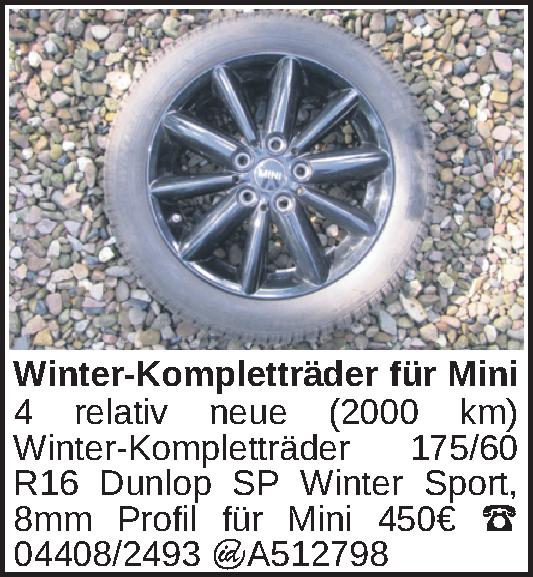 4 relativ neue (2000 km) Winter-Kompletträder 175/60 R60 Dunlop SP Winter Sport, 8mm Profil für Mini