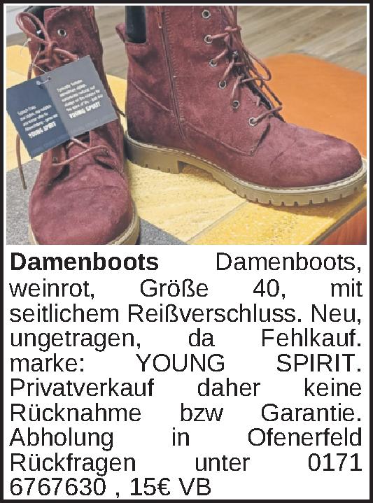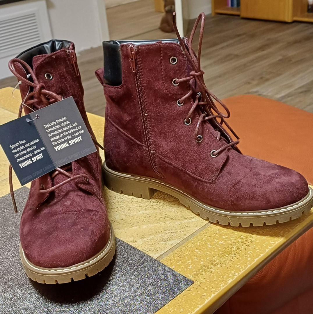 Damenboots, weinrot, Größe 40, mit seitlichem Reißverschluss. Neu, ungetragen, da Fehlkauf. marke: YOUNG SPIRIT.Privatverkauf daher keine Rücknahme bzw Garantie.