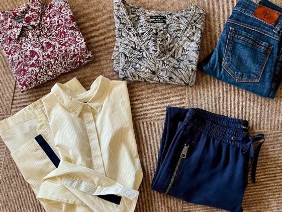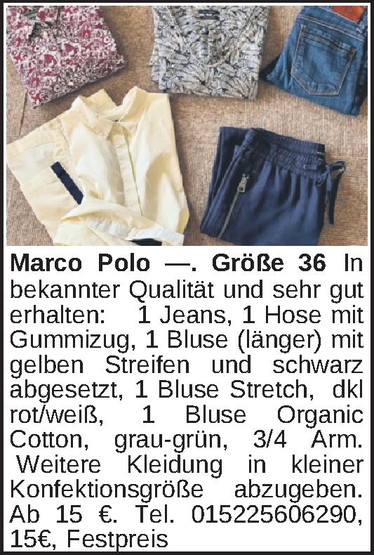 In bekannter Qualität und sehr gut erhalten: 1 Jeans, 1 Hose mit Gummizug, 1 Bluse (länger) mit gelben Streifen und schwarz abgesetzt, 1 Bluse Stretch, dkl rot/weiß, 1 Bluse Organic Cotton, grau-grün, 3/4 Arm. Weitere Kleidung in kleiner KonfeKontakt