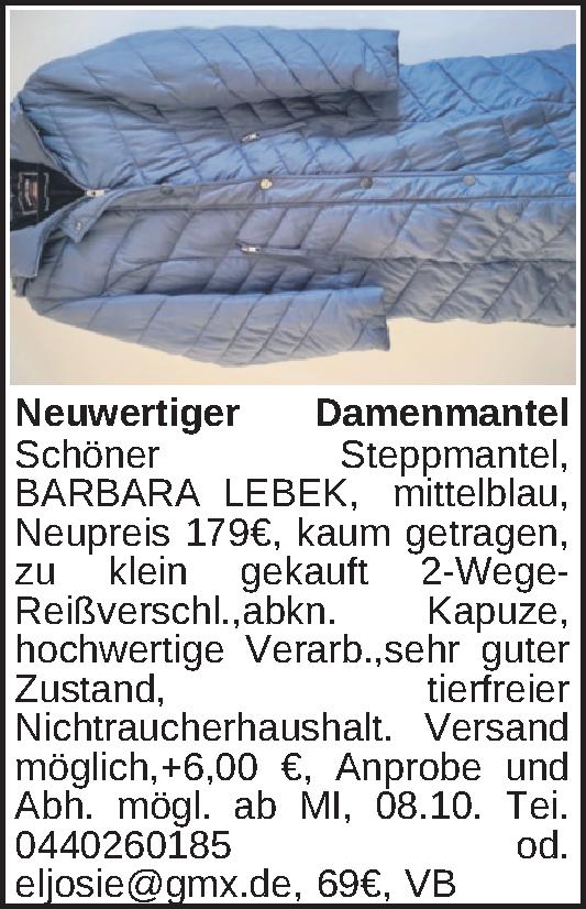 Schöner Steppmantel, BARBARA LEBEK, mittelblau, Neupreis 179€, kaum getragen, zu klein gekauft 2-Wege-Reißverschl.,abkn. Kapuze, hochwertige Verarb.,sehr guter Zustand, tierfreier Nichtraucherhaushalt. Versand möglich,+6,00 €, Anprobe und Abh. mögl