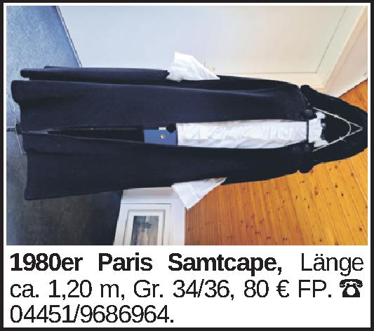 1980er Paris Samtcape, Länge ca. 1,20 m, Gr. 34/36, 80 € FP. ‡ 04451/9686964.Kontakt