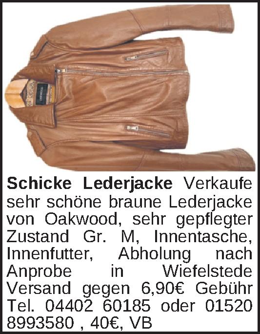 Verkaufe sehr schöne braune Lederjacke von Oakwood, sehr gepflegter ZustandGr. M, Innentasche, Innenfutter, Abholung nach Anprobe in Wiefelstede