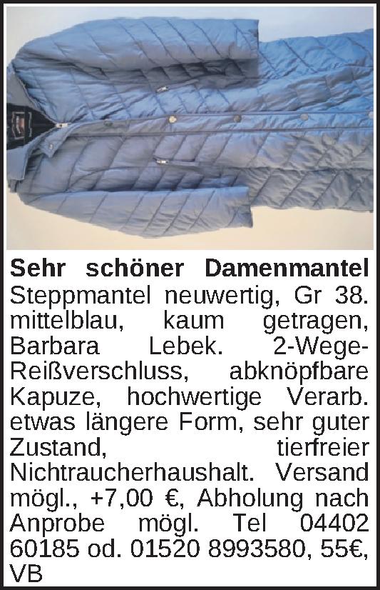 Steppmantel neuwertig, Gr 38. mittelblau, kaum getragen, Barbara Lebek. 2-Wege-Reißverschluss, abknöpfbare Kapuze, hochwertige Verarb. etwas längere Form, sehr guter Zustand, tierfreier Nichtraucherhaushalt. Versand mögl., +7,00 €, Abholung nach Anpr