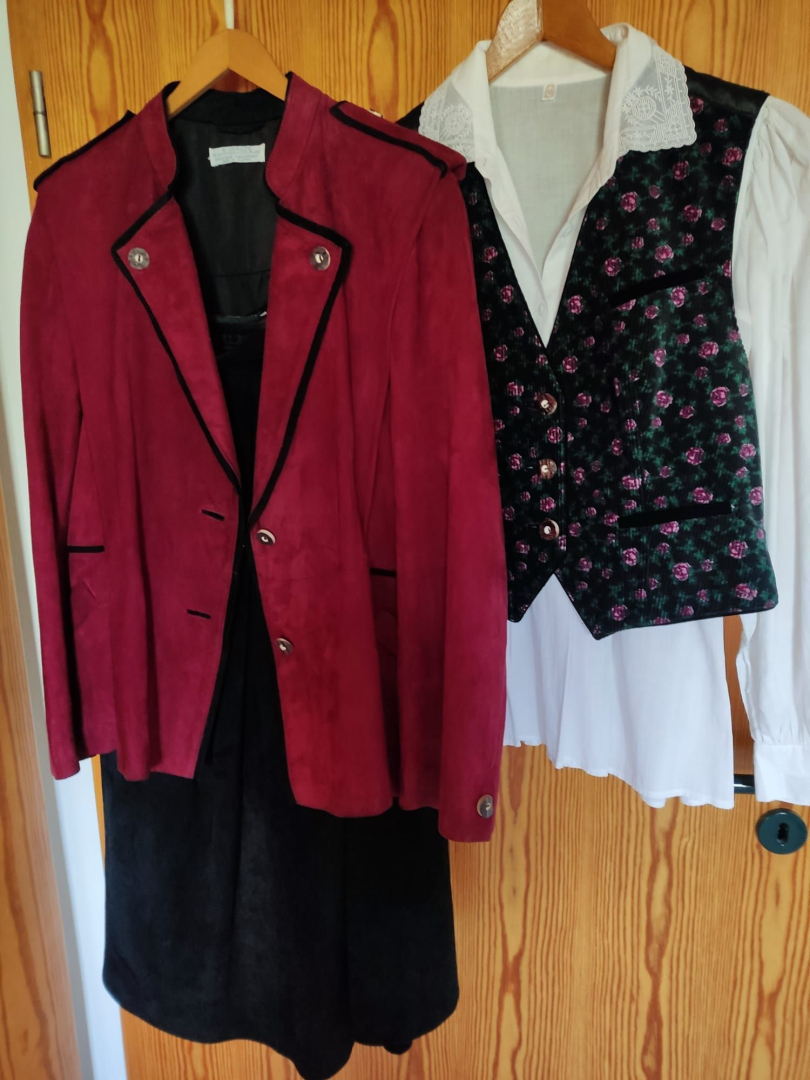 Trachtenkostüm aus Ziegenwildleder, mit Weste und Bluse, in schwarz/bordeauxrot, Größe 40, zu verkaufen