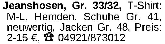 Jeanshosen, Gr. 33/32, T-Shirt: M-L, Hemden, Schuhe Gr. 41, neuwertig, Jacken Gr. 48, Preis: 2-15 €, ‡ 04921/873012Kontakt