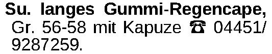 Su. langes Gummi-Regencape, Gr. 56-58 mit Kapuze ‡ 04451/ 9287259.Kontakt