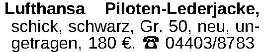 Lufthansa Piloten-Lederjacke, schick, schwarz, Gr. 50, neu, ungetragen, 180 €. ‡ 04403/8783Kontakt