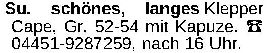 Su. schönes, langes Klepper Cape, Gr. 52-54 mit Kapuze. ‡ 04451-9287259, nach 16 Uhr.Kontakt