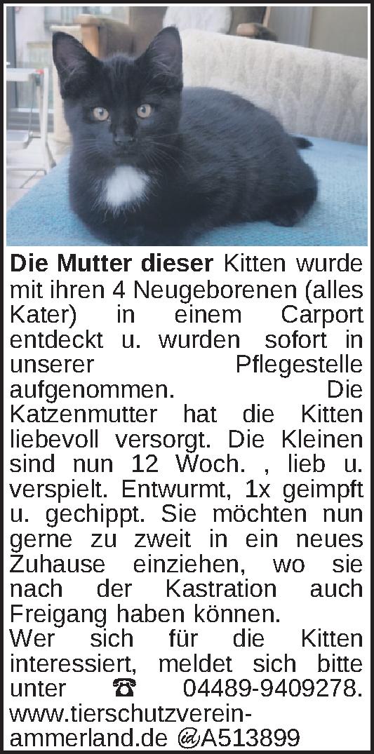 Die Mutter dieser Kitten wurde mit ihren 4 Neugeborenen (alles Kater) in einem Carport entdeckt und so konnte die Katzenfamilie zum Glück sofort in unserer Pflegestelle aufgenommen werden. Hier hat die Mama ihre Kleinen liebevoll versorgt. Die Kitten