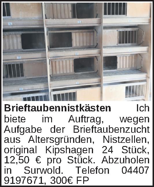Ich biete im Auftrag, wegen Aufgabe der Brieftaubenzucht aus Altersgründen, Nistzellen, original Kipshagen 24 Stück, 12,50 € pro Stück. Abzuholen in Surwold. Telefon 04407 9197671Kontakt