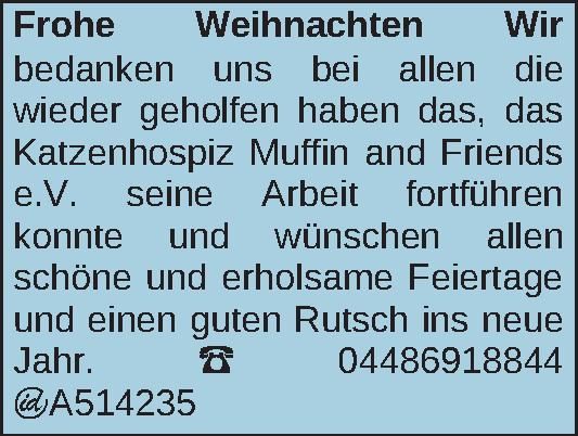Wir bedanken uns bei allen die wieder geholfen haben das, das Katzenhospiz Muffin and Friends e.V. seine Arbeit fortführen konnte und wünschen allen schöne und erholsame Feiertage und einen guten Rutsch ins neue Jahr.