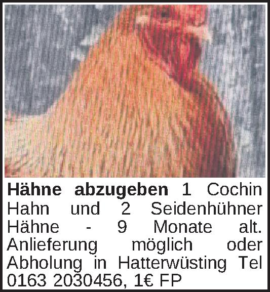1 Cochin Hahn und 2 Seidenhühner Hähne - 9 Monate alt. Anlieferung möglich oder Abholung in HatterwüstingTel 0163 2030456