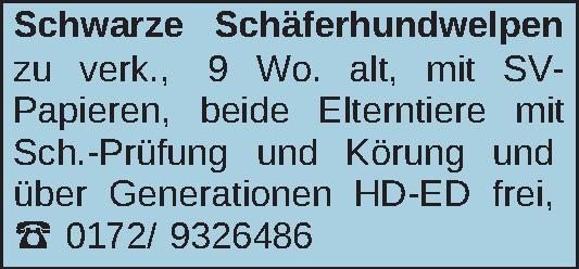 Schwarze Schäferhundwelpen zu verk., 9 Wo. alt, mit SVPapieren, beide Elterntiere mit Sch.-Prüfung und Körung und über Generationen HD-ED frei, ‡ 0172/ 9326486Kontakt
