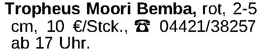 Tropheus Moori Bemba, rot, 2-5 cm, 10 €/Stck., ‡ 04421/38257 ab 17 Uhr.Kontakt