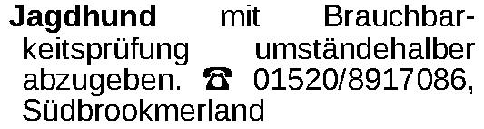 Jagdhund mit Brauchbarkeitsprüfung umständehalber abzugeben. 01520/8917086, Südbrookmerland