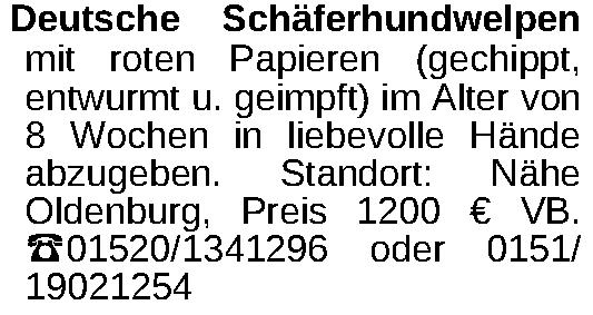 Deutsche Schäferhundwelpen mit roten Papieren (gechippt, entwurmt u. geimpft) im Alter von 8 Wochen in liebevolle Hände abzugeben. Standort: Nähe Oldenburg, Preis 1200 € VB. 01520/1341296 oder 0151/ 19021254