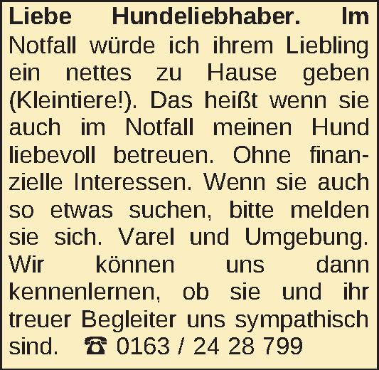 Liebe Hundeliebhaber. Im Notfall würde ich ihrem Liebling ein nettes zu Hause geben (Kleintiere!). Das heißt wenn sie auch im Notfall meinen Hund liebevoll betreuen. Ohne finanzielle Interessen. Wenn sie auch so etwas suchen, bitte melden sie sich. Varel und Umgebung. Wir können uns dann kennenlernen, ob sie und ihr treuer Begleiter uns sympathisch sind. ‡ 0163 / 24 28 799Kontakt