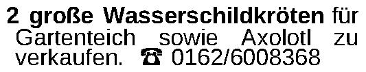 2 große Wasserschildkröten für Gartenteich sowie Axolotl zu verkaufen. 0162/6008368