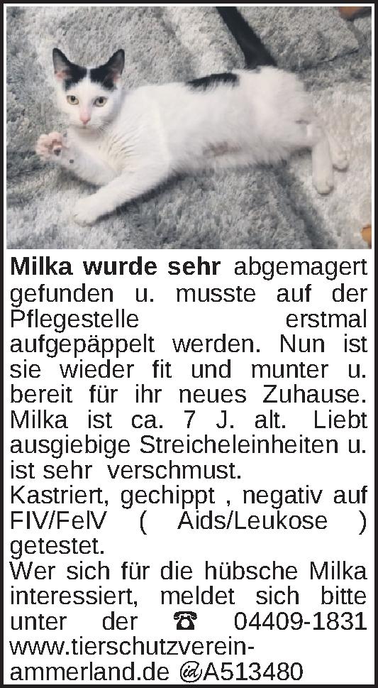Milka wurde sehr abgemagert gefunden u. musste auf der Pflegestelle erstmal aufgepäppelt werden. Nun ist sie wieder bei Kräften, fit und munter und bereit für ihr neues Zuhause.Milka ist ca. 7 Jahre alt. Sie liebt ausgiebige Streicheleinheiten, ist