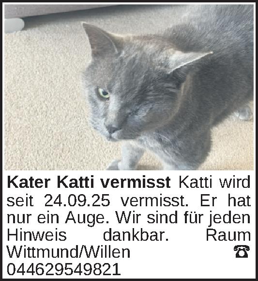 Katti wird seit 24.09.25 vermisst. Er hat nur ein Auge. Raum Wittmund/WillenKontakt