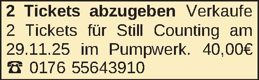 Verkaufe 2 Tickets für Still Counting am 29.11.25 im Pumpwerk.