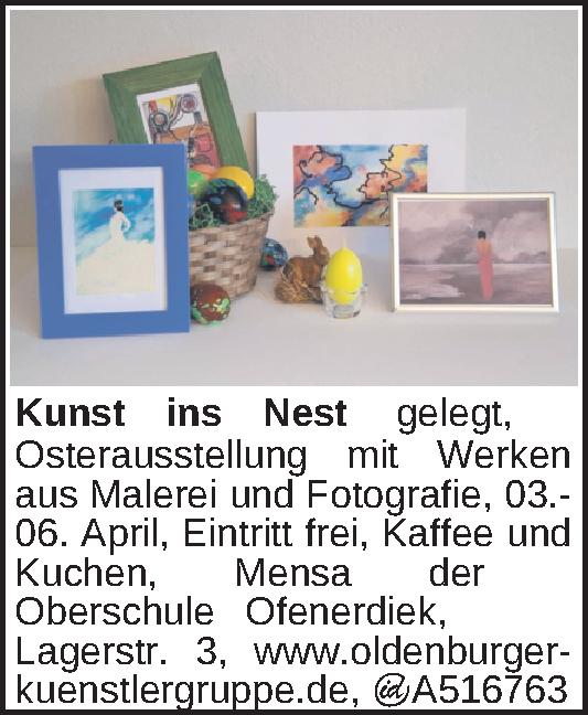 Osterausstellung mit Werken aus Malerei und Fotografie, 03.-06. April, Eintritt frei, Kaffee und Kuchen, Mensa der Oberschule Ofenerdiek, Lagerstr. 3, www.oldenburger-kuenstlergruppe.deKontakt