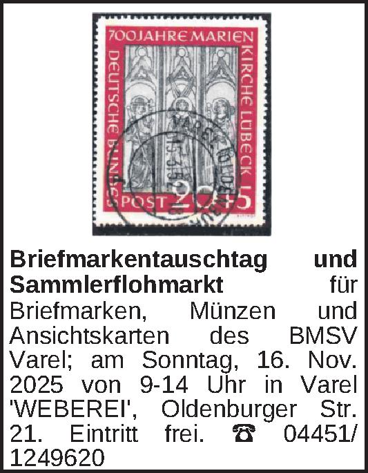 Sammlerflohmarkt für Briefmarken, Münzen und Ansichtskarten des BMSV Varel; am Sonntag, 16. Nov. 2025 von 9-14 Uhr in Varel ‚WEBEREI‘, Oldenburger Str.21. Eintritt frei.Tel.04451/1249620Kontakt