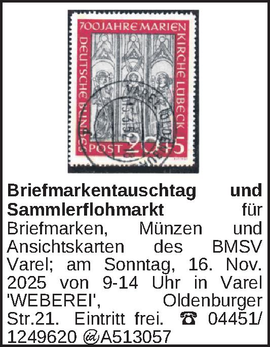 Briefmarkentauschtag und Sammlerflohmarkt für Briefmarken, Münzen und Ansichtskarten des BMSV Varel; am Sonntag, 16. Nov. 2025 von 9-14 Uhr in Varel ‚WEBEREI‘, Oldenburger Str.21. Eintritt frei. Tel.04451/1249620Kontakt