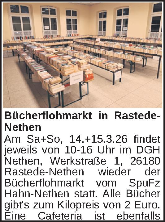 Am Sa+So, 14.+15.3.26 findet jeweils von 10-16 Uhr im DGH Nethen, Werkstraße 1, 26180 Rastede-Nethen wieder der Bücherflohmarkt vom SpuFz Hahn-Nethen statt. Alle Bücher gibt's zum Kilopreis von 2 Euro. Eine Cafeteria ist ebenfalls eingerichtet. KommtKontakt