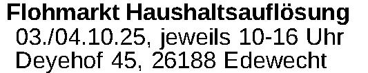 Flohmarkt Haushaltsauflösung 03./04.10.25, jeweils 10-16 Uhr Deyehof 45, 26188 Edewecht