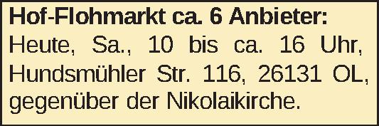 Hof-Flohmarkt ca. 6 Anbieter: Heute, Sa., 10 bis ca. 16 Uhr, Hundsmühler Str. 116, 26131 OL, gegenüber der Nikolaikirche.Kontakt