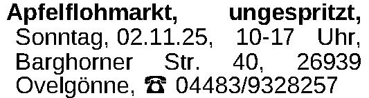 Apfelflohmarkt, ungespritzt, Sonntag, 02.11.25, 10-17 Uhr, Barghorner Str. 40, 26939 Ovelgönne, ‡ 04483/9328257Kontakt