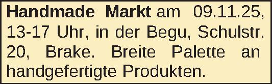 Handmade Markt am 09.11.25, 13-17 Uhr, in der Begu, Schulstr. 20, Brake. Breite Palette an handgefertigte Produkten.Kontakt