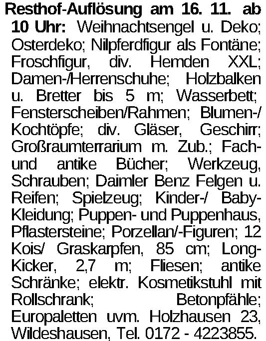 Resthof-Auflösung am 16. 11. ab 10 Uhr: Weihnachtsengel u. Deko; Osterdeko; Nilpferdfigur als Fontäne; Froschfigur, div. Hemden XXL; Damen-/Herrenschuhe; Holzbalken u. Bretter bis 5 m; Wasserbett; Fensterscheiben/Rahmen; Blumen-/ Kochtöpfe; div. Gläser, Geschirr; Großraumterrarium m. Zub.; Fachund antike Bücher; Werkzeug, Schrauben; Daimler Benz Felgen u. Reifen; Spielzeug; Kinder-/ BabyKleidung; Puppen- und Puppenhaus, Pflastersteine; Porzellan/-Figuren; 12 Kois/ Graskarpfen, 85 cm; LongKicker, 2,7 m; Fliesen; antike Schränke; elektr. Kosmetikstuhl mit Rollschrank; Betonpfähle; Europaletten uvm. Holzhausen 23, Wildeshausen, Tel. 0172 - 4223855.