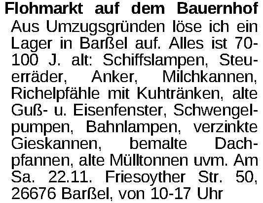 Flohmarkt auf dem Bauernhof Aus Umzugsgründen löse ich ein Lager in Barßel auf. Alles ist 70100 J. alt: Schiffslampen, Steuerräder, Anker, Milchkannen, Richelpfähle mit Kuhtränken, alte Guß- u. Eisenfenster, Schwengelpumpen, Bahnlampen, verzinkte Gieskannen, bemalte Dachpfannen, alte Mülltonnen uvm. Am Sa. 22.11. Friesoyther Str. 50, 26676 Barßel, von 10-17 Uhr