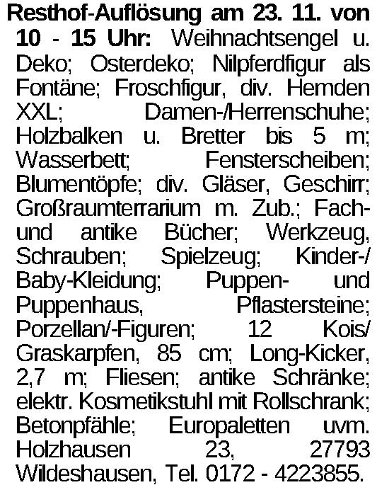 Resthof-Auflösung am 23. 11. von 10 - 15 Uhr: Weihnachtsengel u. Deko; Osterdeko; Nilpferdfigur als Fontäne; Froschfigur, div. Hemden XXL; Damen-/Herrenschuhe; Holzbalken u. Bretter bis 5 m; Wasserbett; Fensterscheiben; Blumentöpfe; div. Gläser, Geschirr; Großraumterrarium m. Zub.; Fachund antike Bücher; Werkzeug, Schrauben; Spielzeug; Kinder-/ Baby-Kleidung; Puppenund Puppenhaus, Pflastersteine; Porzellan/-Figuren; 12 Kois/ Graskarpfen, 85 cm; Long-Kicker, 2,7 m; Fliesen; antike Schränke; elektr. Kosmetikstuhl mit Rollschrank; Betonpfähle; Europaletten uvm. Holzhausen 23, 27793 Wildeshausen, Tel. 0172 - 4223855.